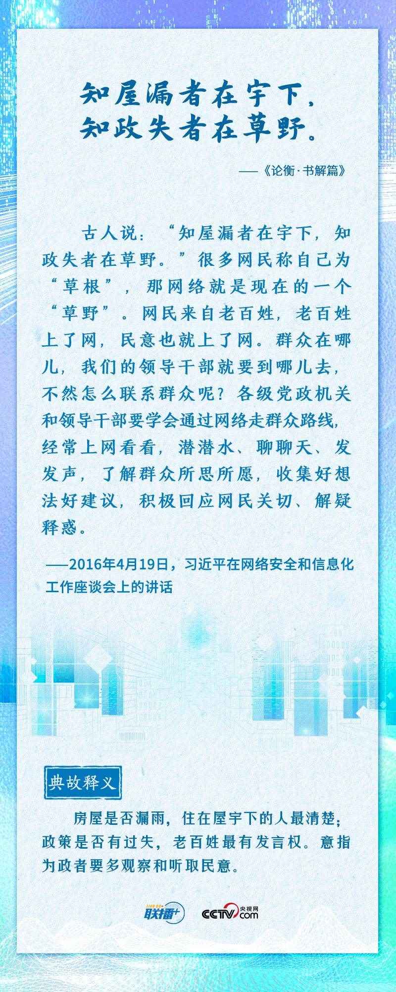 “知屋漏者在宇下,知政失者在草野”“日日行,不怕千萬(wàn)里;常常做,不怕千萬(wàn)事”......2016年4月19日,習(xí)近平總書(shū)記在網(wǎng)絡(luò)安全和信息化工作座談會(huì)上,從六個(gè)方面深刻回答了事關(guān)我國(guó)網(wǎng)信事業(yè)發(fā)展的一系列重大理論和實(shí)踐問(wèn)題,并多次引經(jīng)據(jù)典加以闡述。
