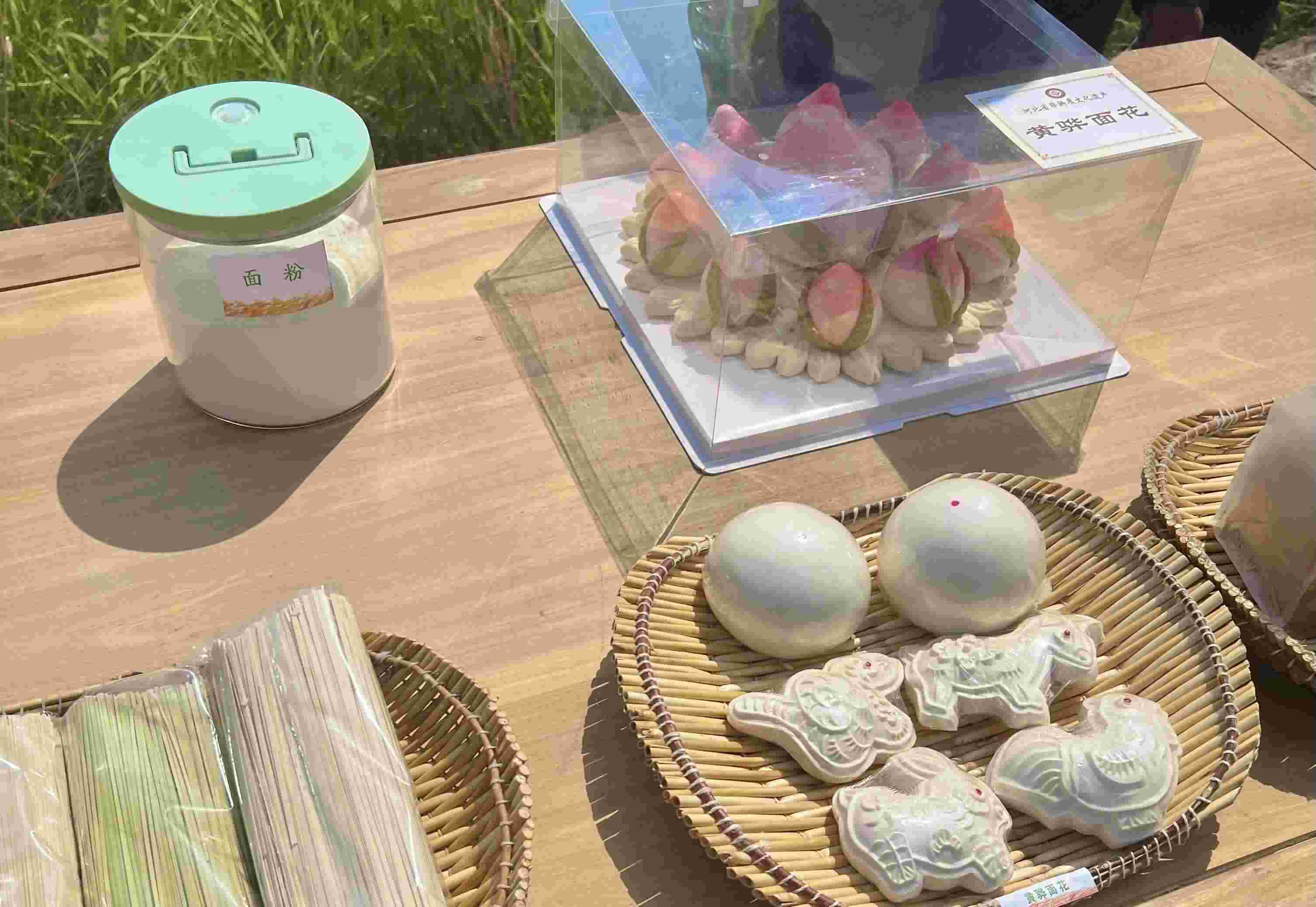 在楊東進家麥田的路邊,擺放著一張長方形的木桌。桌上擺放著用于展示的旱堿麥的植株和麥粒樣本,以及由旱堿麥制成的面粉、掛面、饅頭和黃驊面花等產(chǎn)品,總書記在這里駐足觀看。印刻著寓意吉祥圖案的黃驊面花,被列為省級非物質文化遺產(chǎn)。
