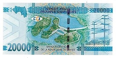 △在幾內(nèi)亞央行發(fā)行的該國(guó)最大面值兩萬(wàn)幾郎紙幣上,印著中國(guó)長(zhǎng)江三峽集團(tuán)有限公司總承建的凱樂塔水電站。