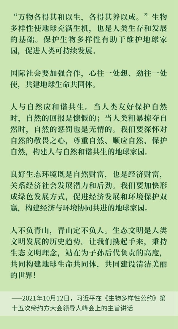 今天,讓我們重溫習(xí)近平主席講話(huà)金句,進(jìn)一步認(rèn)識(shí)生物多樣性保護(hù)的重要性,以實(shí)際行動(dòng)保護(hù)我們的地球家園。