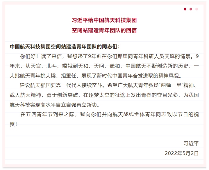 衛(wèi)星發(fā)射前,科普小衛(wèi)星研制團(tuán)隊(duì)的學(xué)生們給習(xí)近平總書(shū)記寫(xiě)信,報(bào)告了小衛(wèi)星即將發(fā)射的消息??倳?shū)記在回信中希望孩子們“保持對(duì)知識(shí)的渴望,保持對(duì)探索的興趣,培育科學(xué)精神,刻苦學(xué)習(xí),努力實(shí)踐”。