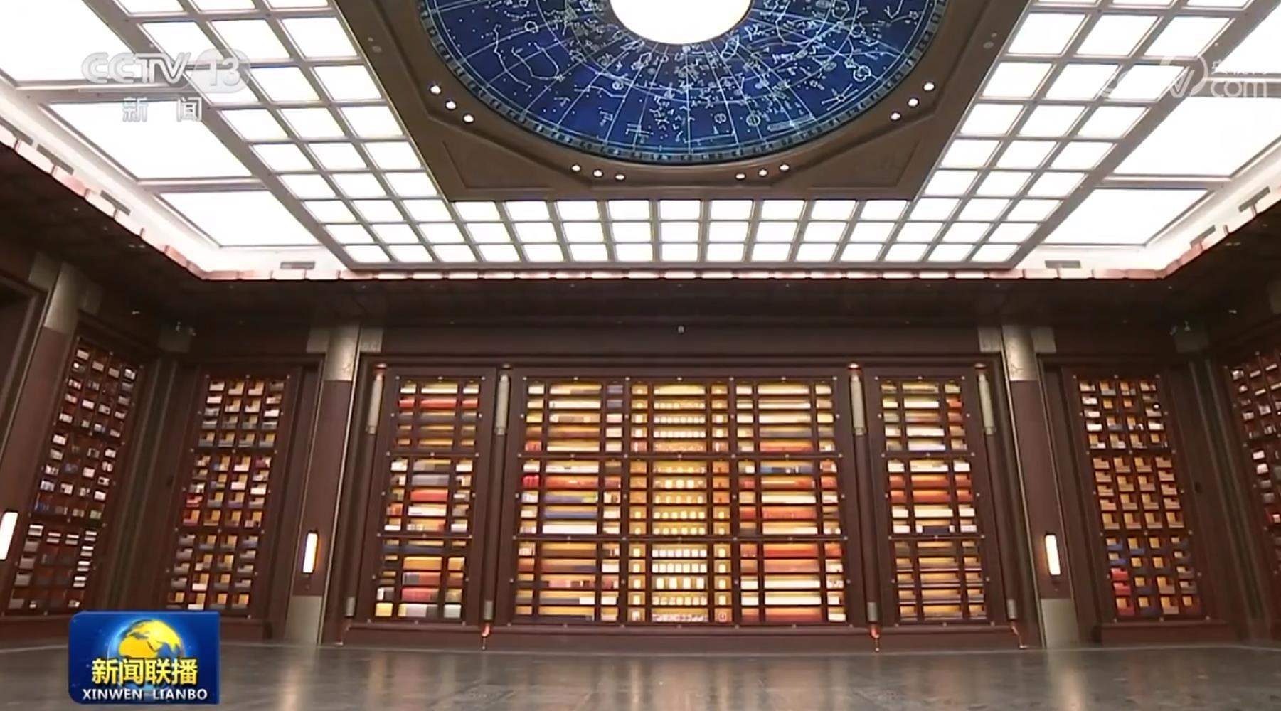 走進(jìn)國(guó)家書房,映入眼簾的是44個(gè)巨型書柜,抬頭可見宋代石刻天文圖的星空穹頂,四周由10根木柱造型營(yíng)造出空間的序列感,每個(gè)柱頭的祥云牡丹端莊秀雅,柱礎(chǔ)的江崖海水則體現(xiàn)了中國(guó)古代藏書閣必備的以水鎮(zhèn)火的寓意。