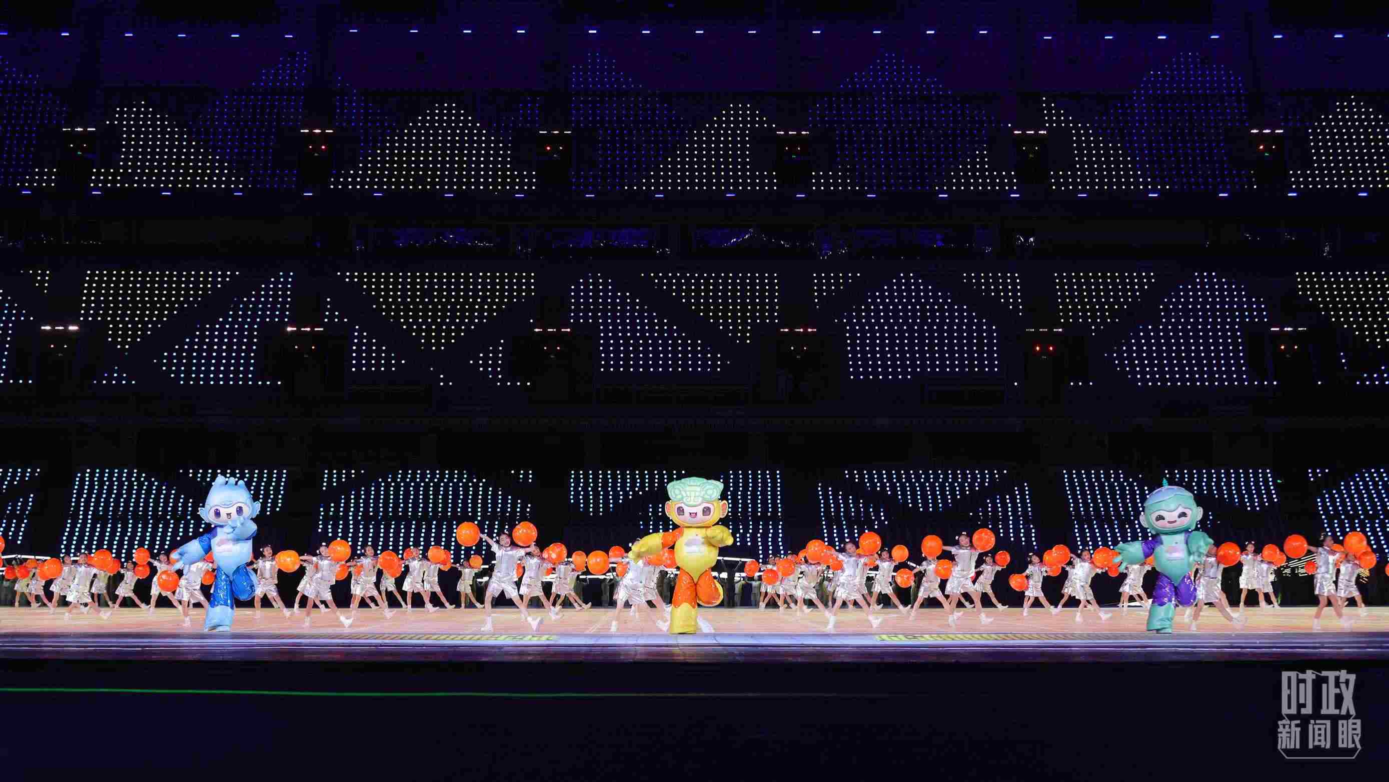 △開幕式文藝表演中的亞運(yùn)會(huì)吉祥物。(總臺(tái)央視記者魏幫軍拍攝)