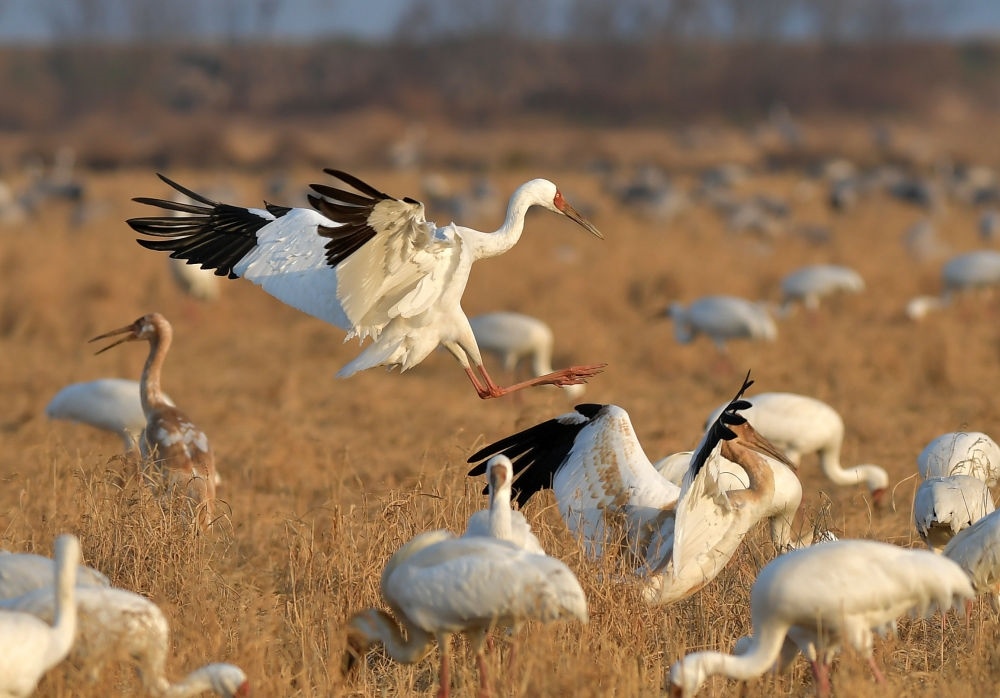 這是2021年1月15日在鄱陽湖畔的江西余干縣康山墾殖場插旗洲拍攝的白鶴。隨著長江重點(diǎn)水域生態(tài)修復(fù)措施的落實(shí),鄱陽湖環(huán)境正發(fā)生嬗變。江西鄱陽湖國家級自然保護(hù)區(qū)管理局2022年新年伊始發(fā)布的鄱陽湖區(qū)最新鳥情數(shù)據(jù)顯示,工作人員在野外監(jiān)測統(tǒng)計到水鳥76.6萬余只,創(chuàng)有監(jiān)測記錄以來新高。