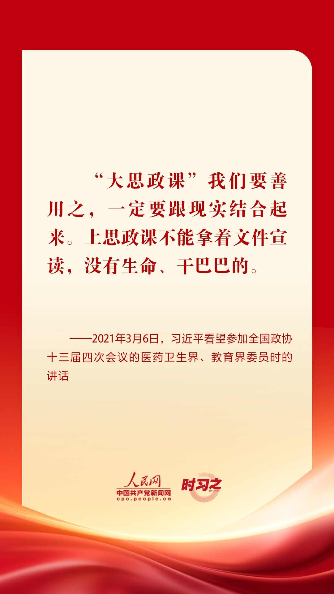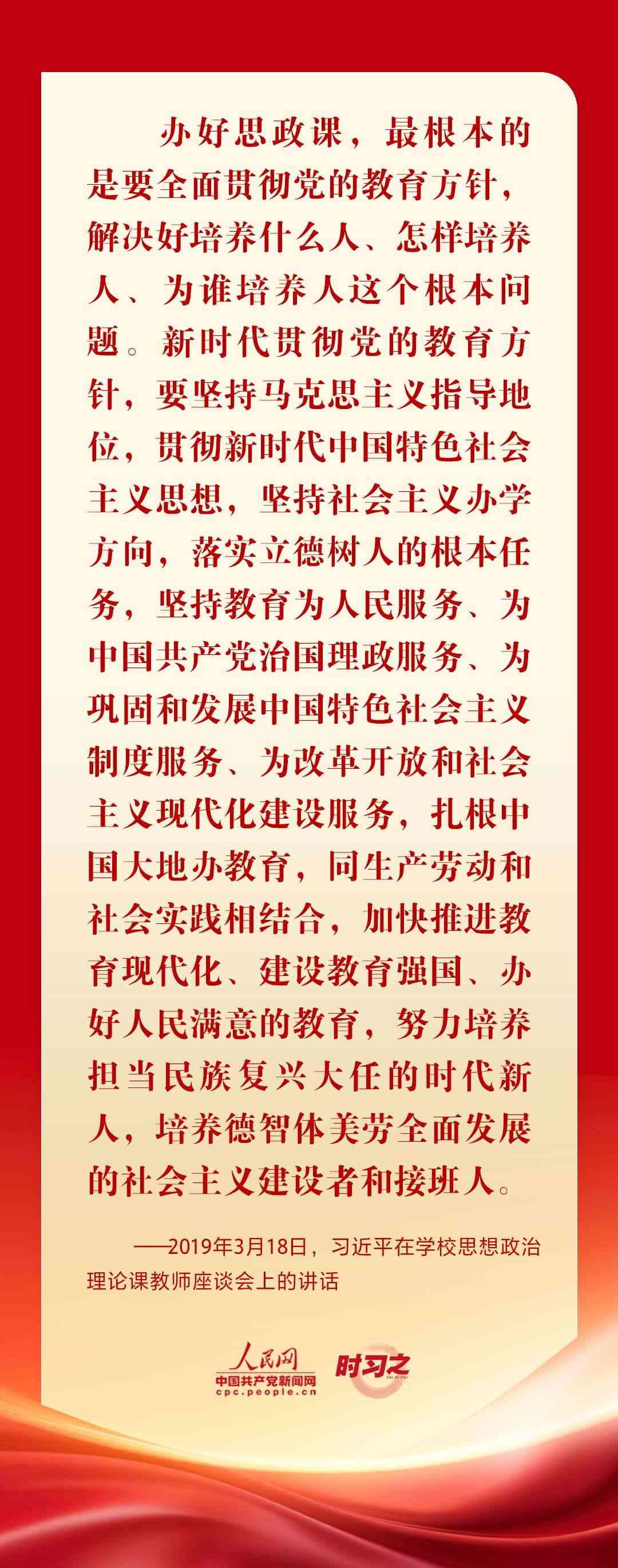 “思政課是落實(shí)立德樹人根本任務(wù)的關(guān)鍵課程,思政課作用不可替代,思政課教師隊(duì)伍責(zé)任重大?!秉h的十八大以來(lái),從召開全國(guó)高校思想政治工作會(huì)議、全國(guó)教育大會(huì)、學(xué)校思想政治理論課教師座談會(huì),到多次赴學(xué)??疾旌蛶熒涣髡勑模?xí)近平總書記圍繞思政課建設(shè)作出一系列重要論述,為辦好思政課提供根本遵循。