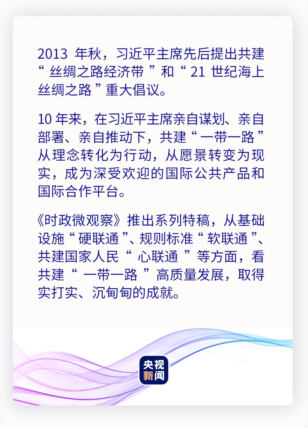 10年來(lái),共建“一帶一路”以高標(biāo)準(zhǔn)、可持續(xù)、惠民生為目標(biāo),以規(guī)則標(biāo)準(zhǔn)“軟聯(lián)通”為重要支撐,為促進(jìn)全球互聯(lián)互通、共同發(fā)展增添新動(dòng)力,推動(dòng)高質(zhì)量共建“一帶一路”不斷走深走實(shí)。