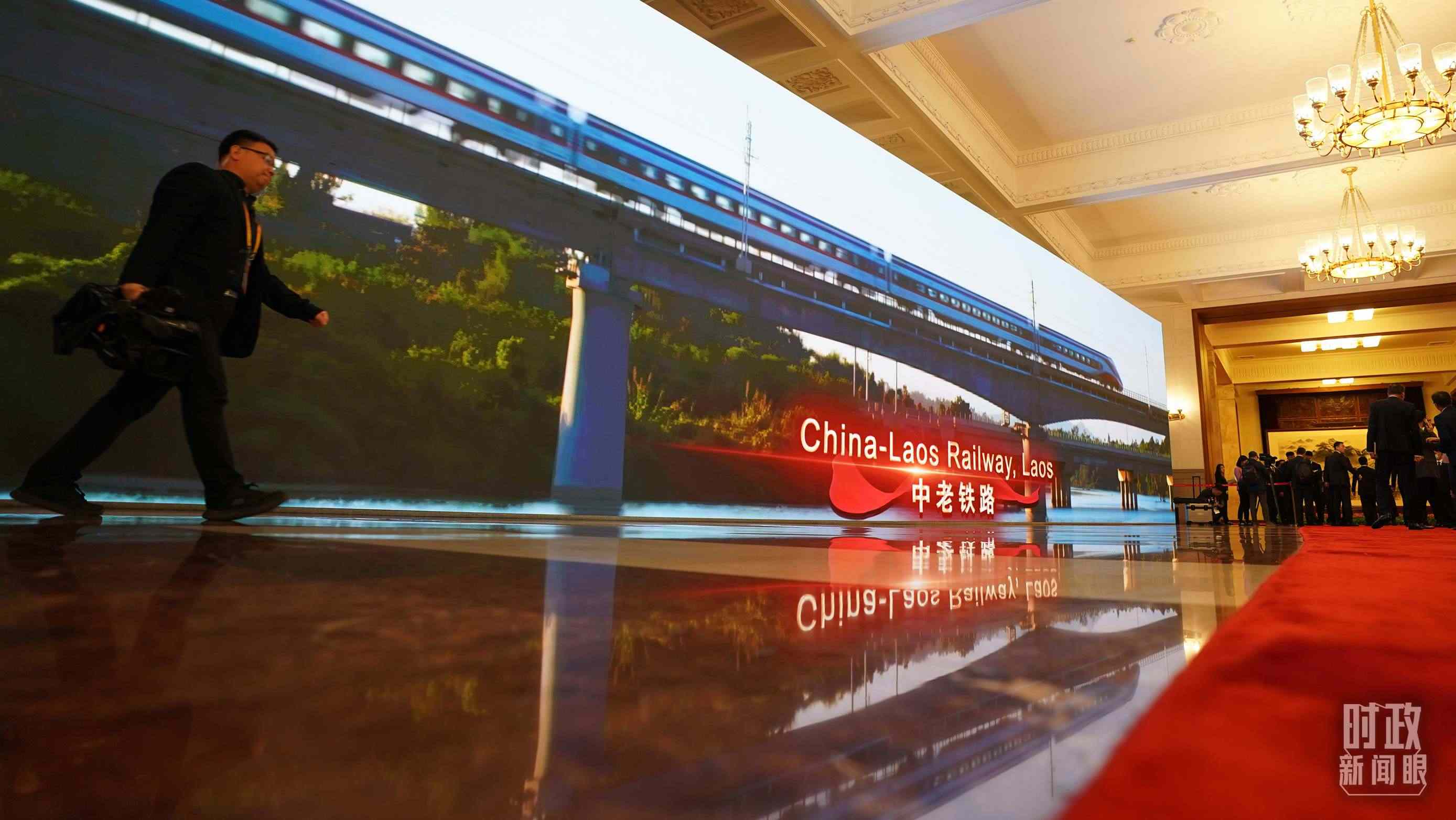 △人民大會(huì)堂內(nèi)大屏幕展示共建“一帶一路”合作項(xiàng)目。(總臺(tái)國(guó)廣記者李晉拍攝)