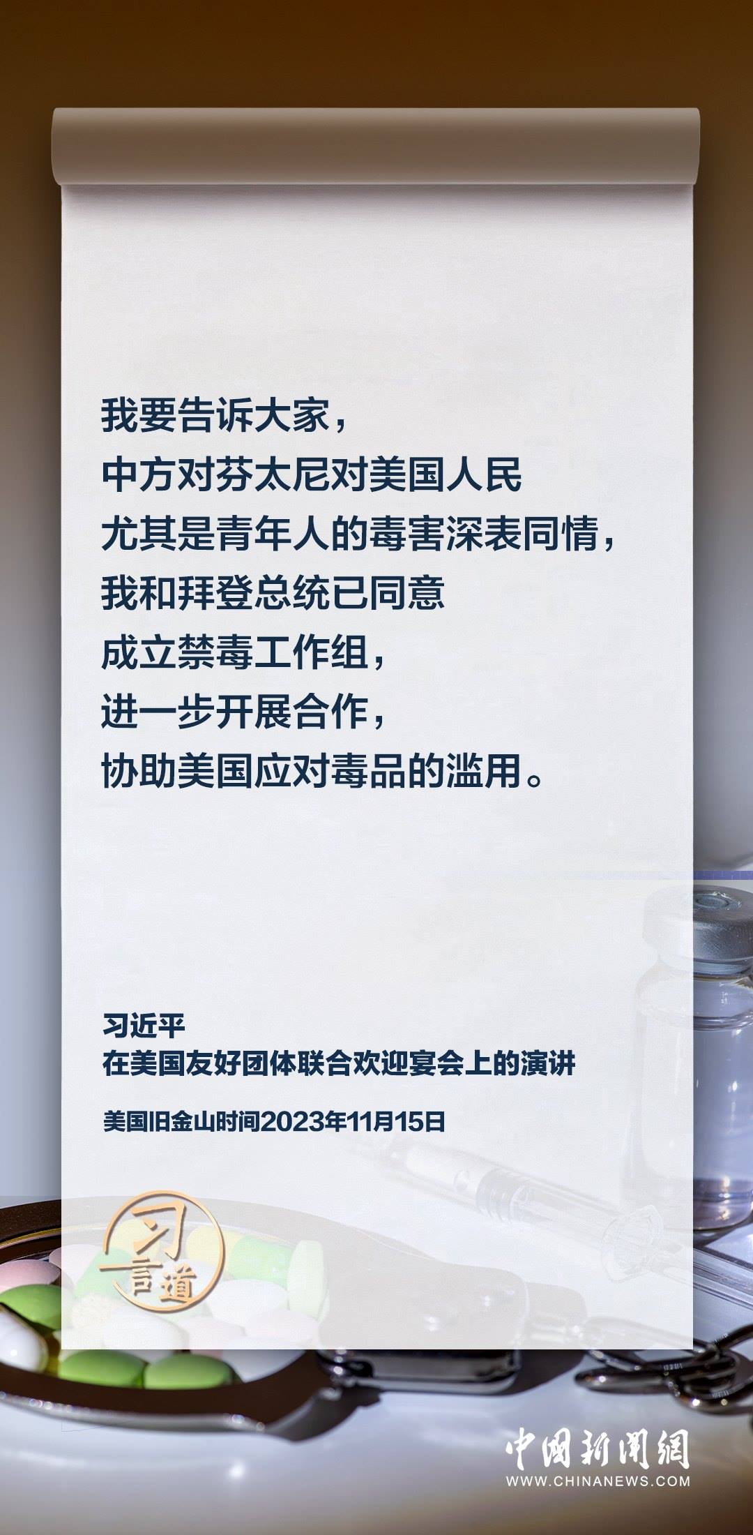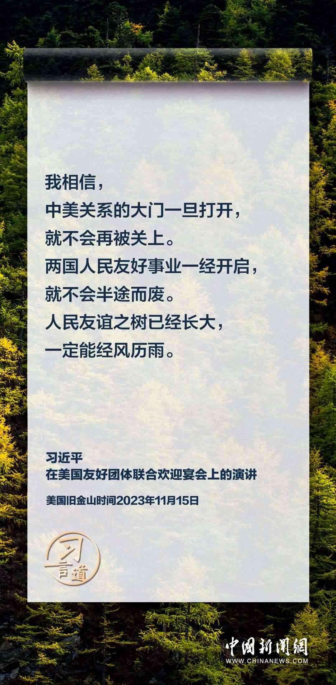 當(dāng)?shù)貢r間11月15日,中國國家主席習(xí)近平在美國舊金山出席美國友好團體聯(lián)合歡迎宴會并發(fā)表演講。習(xí)近平在演講中從“我”和“我們”說起,提出中國主張、表明中國立場、展現(xiàn)大國擔(dān)當(dāng),話語擲地有聲。