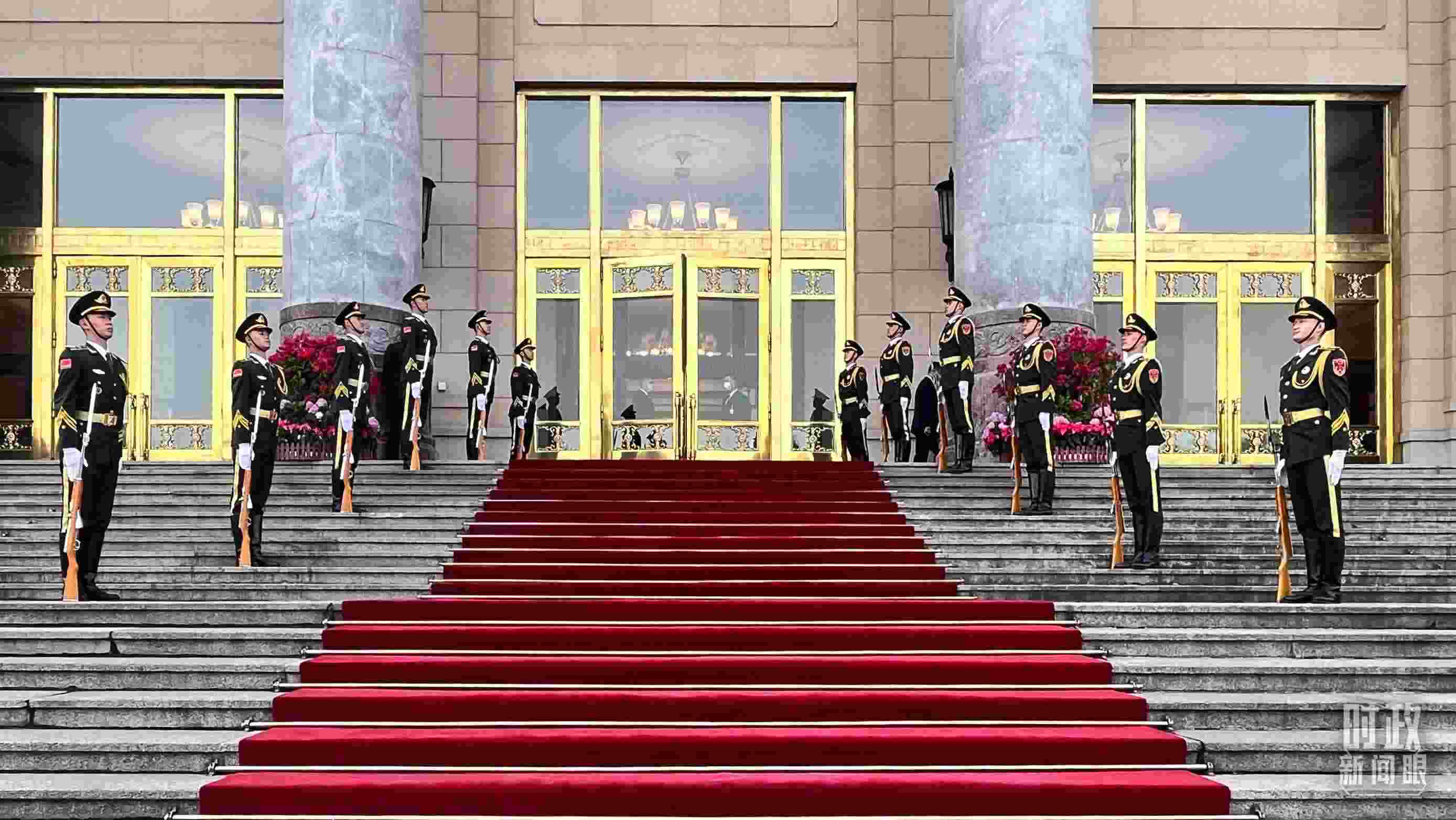 △ 2023年10月17日至20日,習(xí)近平主席在北京人民大會(huì)堂密集會(huì)見(jiàn)了26位外方領(lǐng)導(dǎo)人。圖為禮兵列隊(duì)迎接貴賓。(總臺(tái)央視記者張垚拍攝)