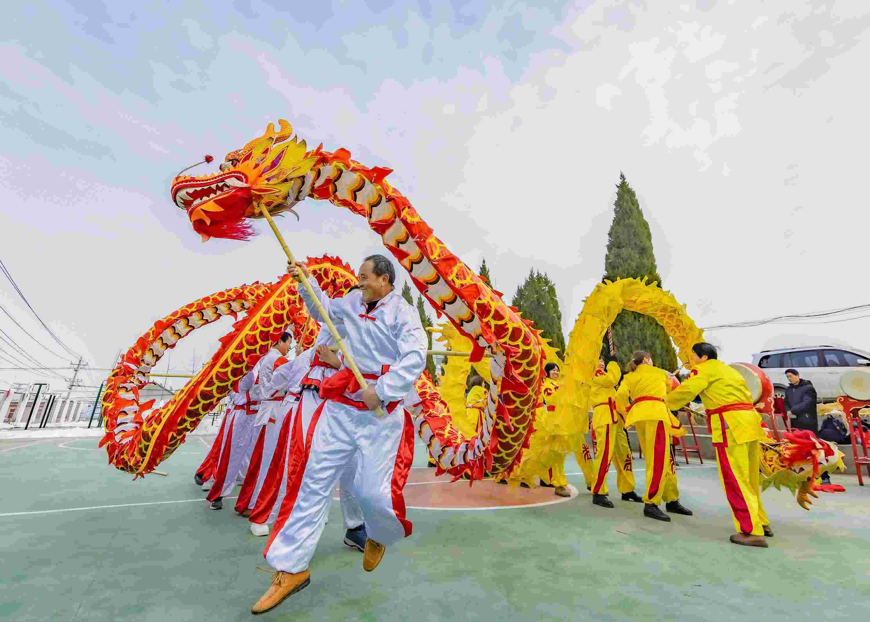 △ 江蘇宿遷兩支舞龍隊正在為村民表演雙龍狂舞鬧新春。
