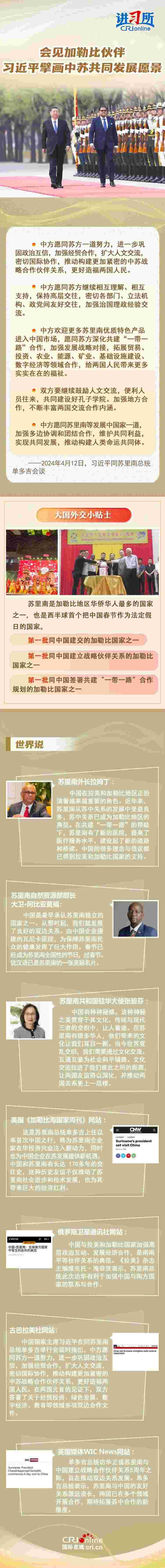 蘇里南是第一批同中國(guó)建交的加勒比國(guó)家之一。幾十年來(lái),兩國(guó)雖相距萬(wàn)里,卻始終相互尊重、平等相待,有著深厚的兄弟情誼。此次兩國(guó)元首會(huì)談受到國(guó)際社會(huì)關(guān)注,評(píng)論稱(chēng)兩國(guó)關(guān)系是南南合作的典范。