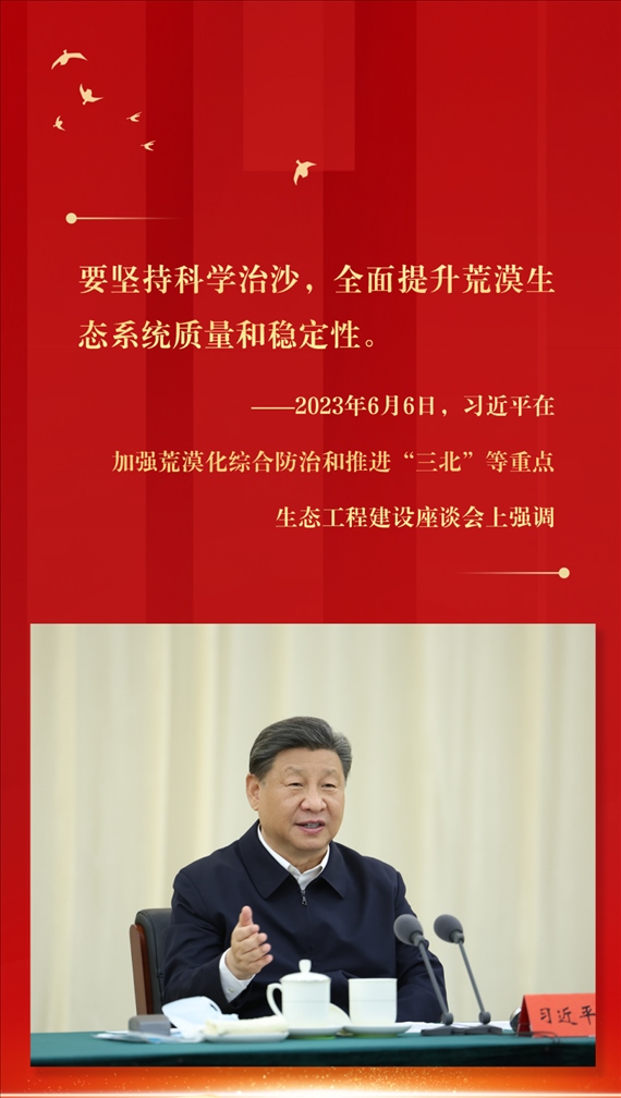 2023年6月5日至6日,習(xí)近平在內(nèi)蒙古巴彥淖爾考察,并主持召開(kāi)加強(qiáng)荒漠化綜合防治和推進(jìn)“三北”等重點(diǎn)生態(tài)工程建設(shè)座談會(huì)。這是6日上午,習(xí)近平在臨河區(qū)國(guó)營(yíng)新華林場(chǎng)考察。