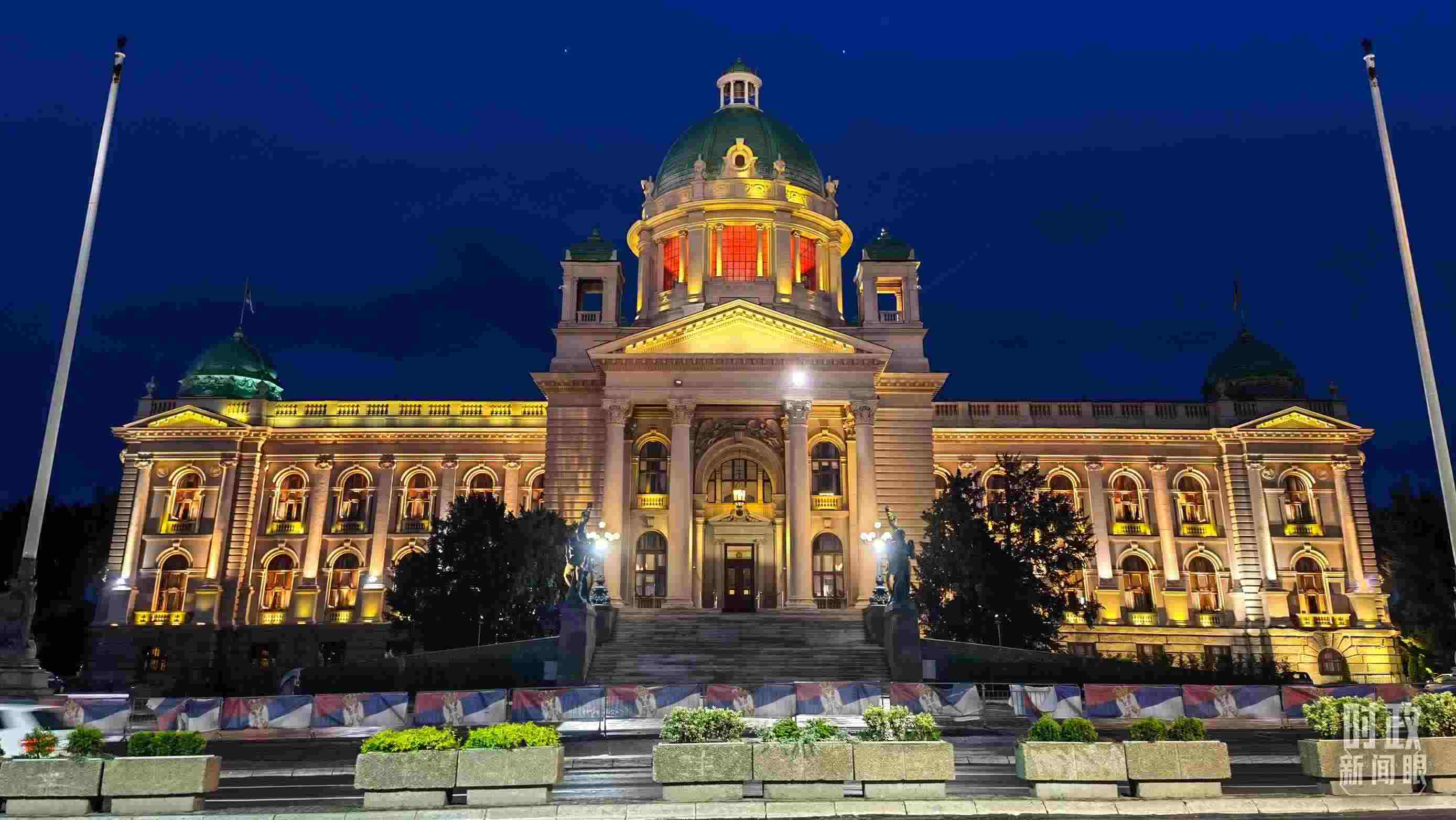 △塞爾維亞國會(huì)大廈亮起紅燈,歡迎習(xí)主席到訪。(總臺(tái)央視記者石丞拍攝)