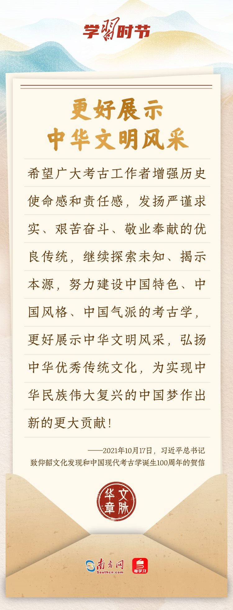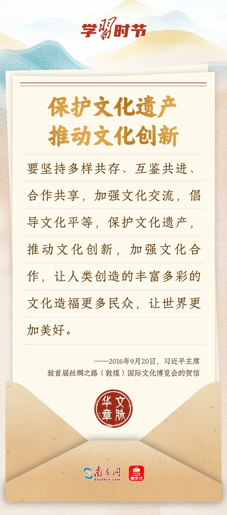 “中華民族在幾千年歷史中創(chuàng)造和延續(xù)的中華優(yōu)秀傳統(tǒng)文化,是中華民族的根和魂?!绷暯娇倳浂啻瓮ㄟ^發(fā)賀信、寫回信等方式,表達著對弘揚中華優(yōu)秀傳統(tǒng)文化的殷切希望,飽含深情、字字暖心、催人奮進。讓我們一起“讀”信。