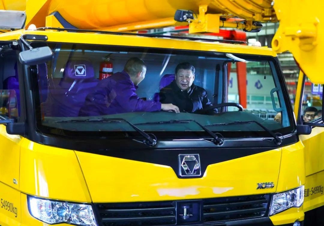 △2017年12月12日,習近平總書記在江蘇徐州徐工集團坐進剛下線的XCA220型全地面起重機駕駛室,向技術人員詳細詢問起重機的性能、產(chǎn)量、價格等。