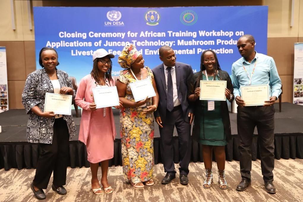 8月6日,非洲地區(qū)菌草技術(shù)培訓(xùn)班結(jié)業(yè)儀式在盧旺達(dá)首都基加利舉行,多國學(xué)員合影留念。新華社發(fā)(黃萬晴攝)