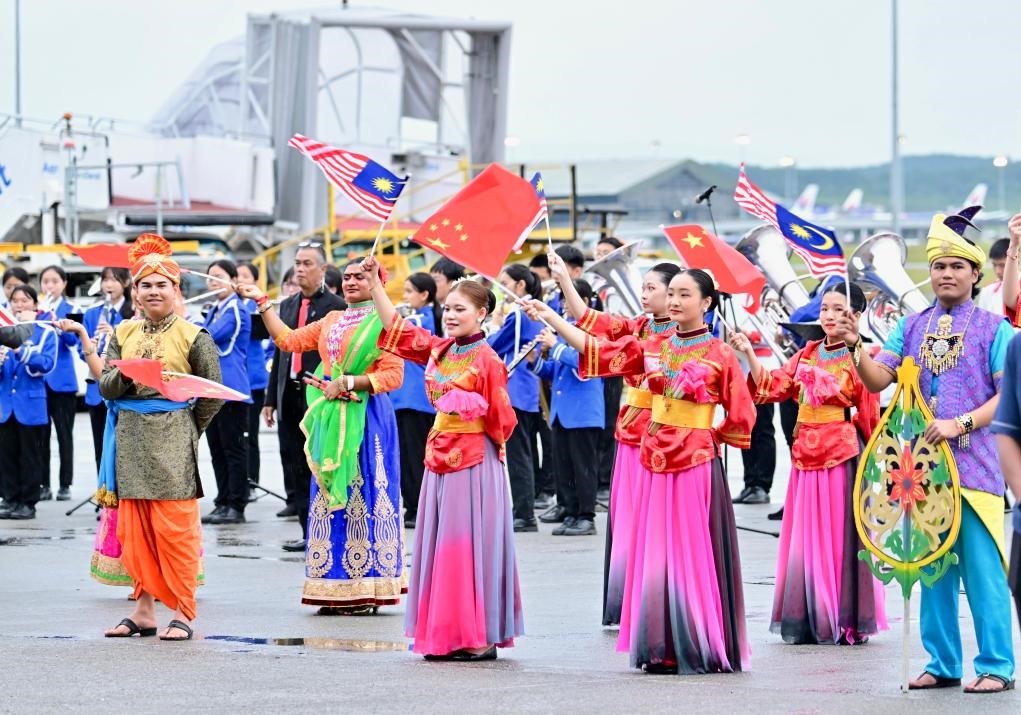 馬來西亞兒童向習(xí)近平獻(xiàn)花,馬來西亞青少年表演富有當(dāng)?shù)靥厣奈璧?,揮舞中馬兩國國旗,熱烈歡迎習(xí)近平到訪。