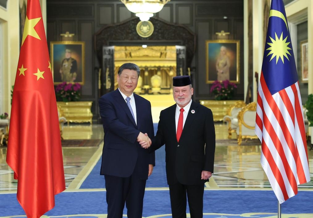 4月16日上午,易卜拉欣在馬來西亞國家王宮廣場(chǎng)為習(xí)近平舉行隆重歡迎儀式。