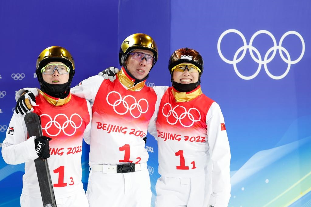 2月10日,中國隊選手賈宗洋(中)、徐夢桃(右)和齊廣璞(左)在自由式滑雪空中技巧混合團(tuán)體比賽后等待成績公布。新華社記者費(fèi)茂華攝