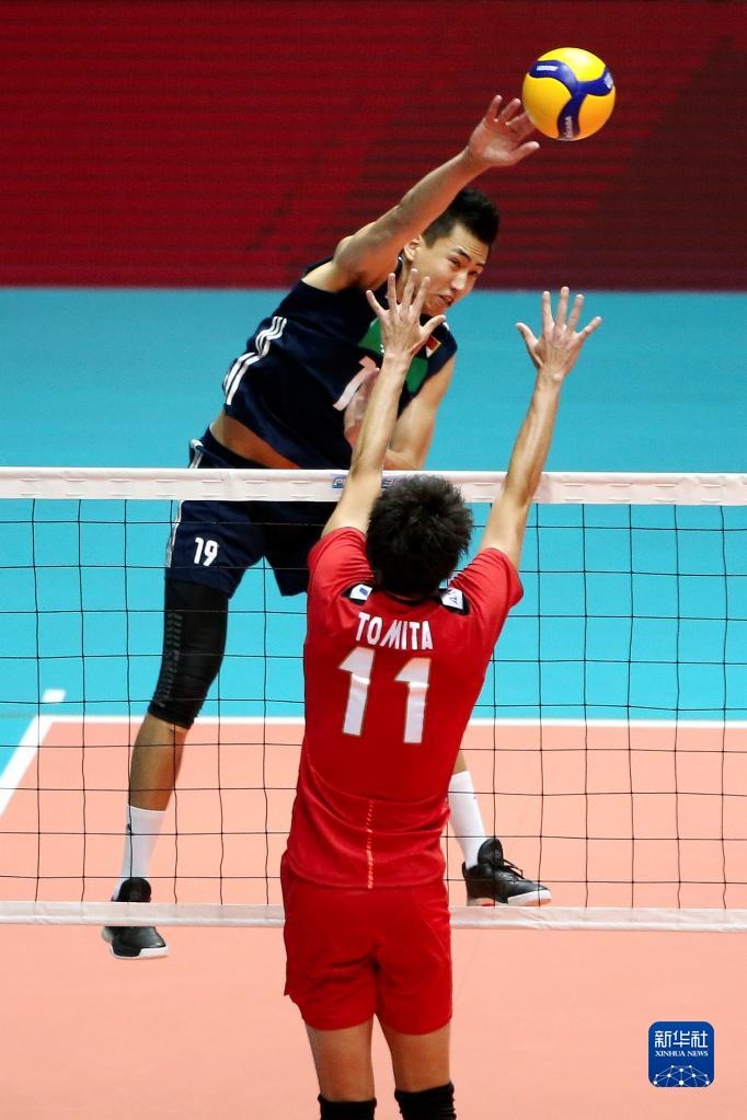 8月14日,中國隊(duì)球員張景胤(左一)在比賽中扣球。新華社記者 王騰 攝