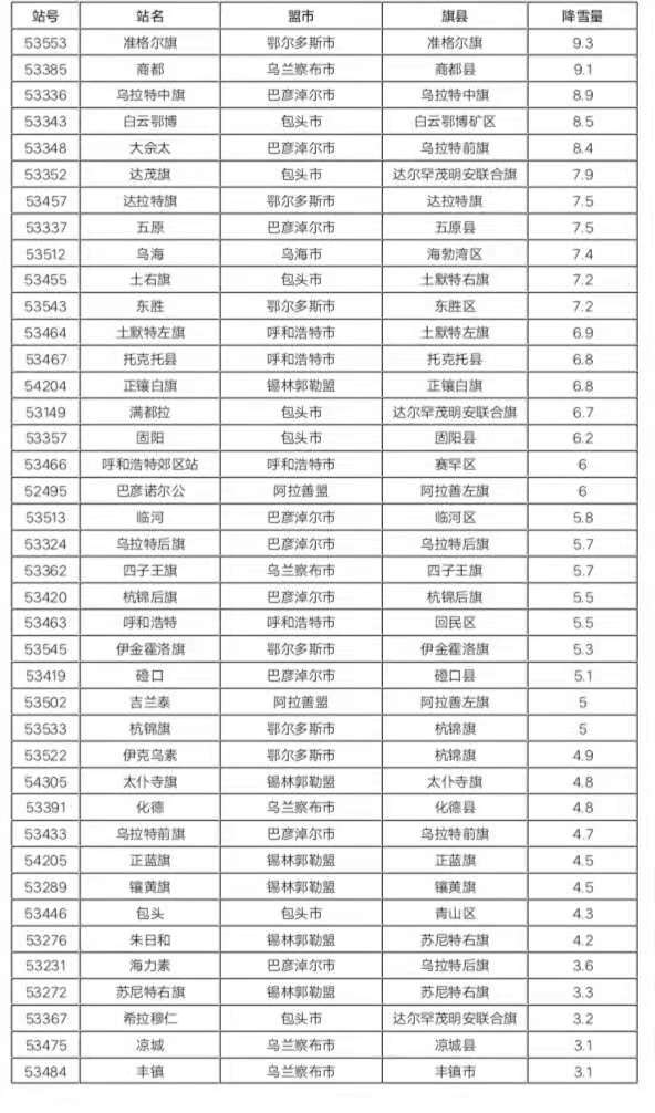 大雪:25個旗縣共27個站出現(xiàn)大雪,其中,鄂爾多斯市準格爾旗9.3毫米、烏蘭察布市商都縣9.1毫米、巴彥淖爾市烏拉特中旗8.9毫米。