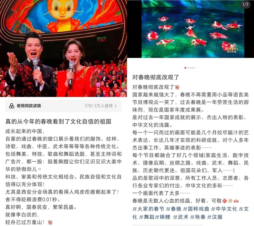 春晚的文化展現(xiàn),在國人中也引起了熱烈反響?!懊恳粋€(gè)文化類節(jié)目都蘊(yùn)含著獨(dú)特的中國之美,這種美有的跨越千年,有的多經(jīng)磨難,春晚給我們呈現(xiàn)了一場(chǎng)場(chǎng)宏大的視聽盛宴,作為觀眾很難不動(dòng)容”“從今年春晚真真切切地感受到了文化自信,大好河山,傳統(tǒng)文化,國家強(qiáng)盛,美美與共”“文化傳統(tǒng)特色給各個(gè)節(jié)目都刷了創(chuàng)意的漆,霸氣從節(jié)目中升騰,自信從感嘆中生發(fā),真妙”......