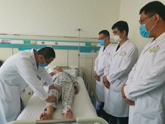 骨一科喬強(qiáng)主任為關(guān)節(jié)置換術(shù)后患者功能鍛煉。