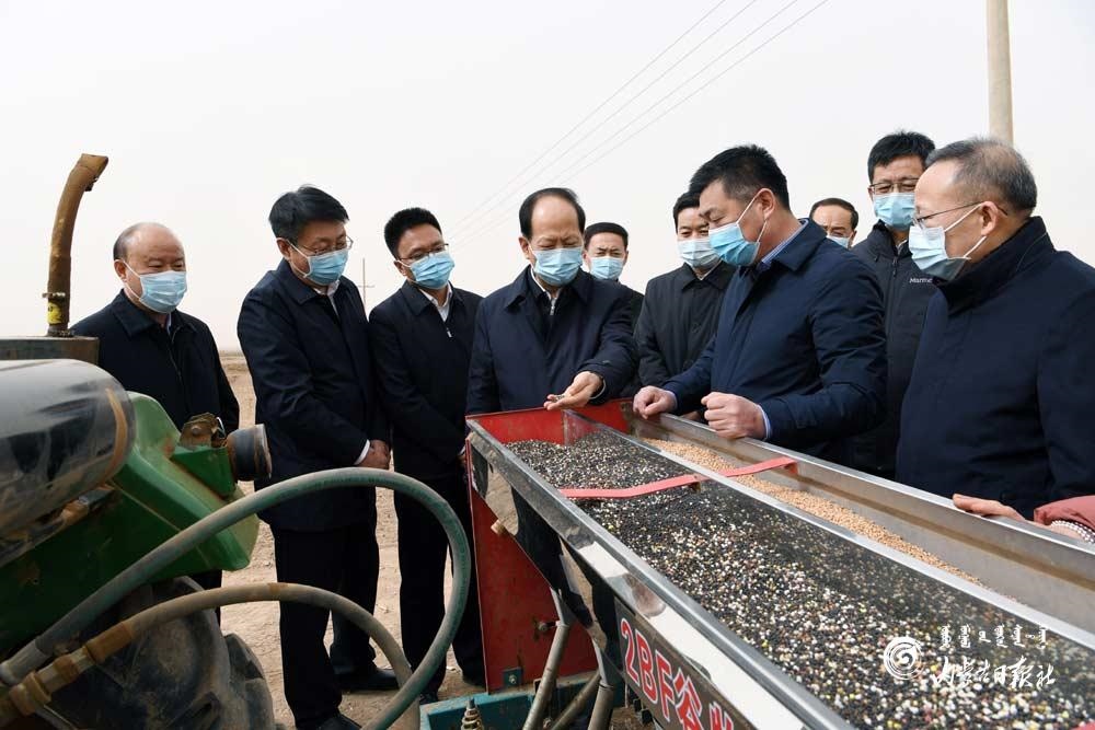 驚蟄已過,春耕在即。石泰峰一下飛機(jī)就驅(qū)車來到臨河農(nóng)場八分場,直奔田間地頭,考察春耕備耕情況。在小麥播種現(xiàn)場,他與種植戶和當(dāng)?shù)馗刹抗苍掁r(nóng)桑,詳細(xì)了解土壤墑情、測土施肥、種植結(jié)構(gòu)、糧播面積、春耕資金保障等情況,并與大家一筆筆測算成本、估算收入。石泰峰說,當(dāng)前正值農(nóng)業(yè)生產(chǎn)的關(guān)鍵時期,各地要不違農(nóng)時地謀劃好組織好各項工作,加強農(nóng)機(jī)、農(nóng)資、種子供應(yīng)儲備,研究搞好市場供需調(diào)度和產(chǎn)銷對接,為今年糧食豐收和農(nóng)民增收打好基礎(chǔ)。他指出,耕地是最寶貴的資源,我們既要用好耕地,也要采取有效措施護(hù)地養(yǎng)地,推動農(nóng)業(yè)可持續(xù)發(fā)展?! ?/p>