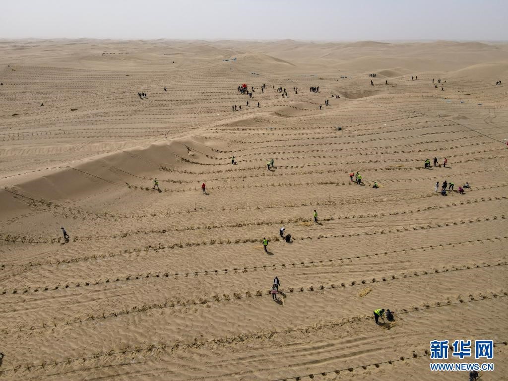 人們?cè)诰嚯x新疆且末縣城不遠(yuǎn)處的塔克拉瑪干沙漠內(nèi)植樹(3月28日攝,無(wú)人機(jī)照片)。新華社記者 高晗 攝