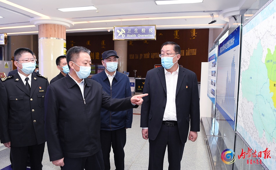5月16日,自治區(qū)黨委書記孫紹騁來到策克口岸,詳細了解口岸建設和疫情防控情況。記者袁永紅攝