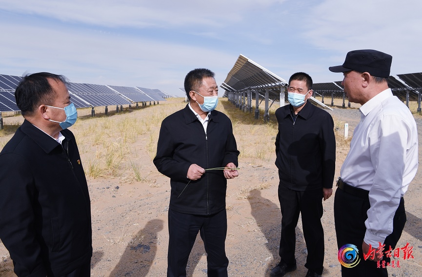 5月17日,自治區(qū)黨委書記孫紹騁考察阿拉善左旗內(nèi)蒙古巴音新能源有限公司新能源基地建設及光伏治沙情況。記者袁永紅攝
