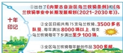 黨的十八大以來,烏蘭牧騎事業(yè)發(fā)展進(jìn)入快車道。自治區(qū)制定了一系列加快推進(jìn)烏蘭牧騎事業(yè)發(fā)展的政策,出臺(tái)了《內(nèi)蒙古自治區(qū)烏蘭牧騎條例》和《烏蘭牧騎事業(yè)中長期發(fā)展規(guī)劃(2021-2030年)》。設(shè)立全區(qū)烏蘭牧騎事業(yè)發(fā)展專項(xiàng)經(jīng)費(fèi),為75支烏蘭牧騎配備演出大巴車,新建烏蘭牧騎宮,舉辦烏蘭牧騎藝術(shù)節(jié)、全區(qū)烏蘭牧騎新人新作比賽,開展全區(qū)烏蘭牧騎交流演出、“烏蘭牧騎月”等活動(dòng),促進(jìn)烏蘭牧騎互相學(xué)習(xí)發(fā)展。開發(fā)“網(wǎng)上烏蘭牧騎”PC版網(wǎng)頁和手機(jī)版微信H5,成立烏蘭牧騎輔導(dǎo)工作隊(duì)、志愿服務(wù)工作隊(duì),為基層農(nóng)牧民提供藝術(shù)培訓(xùn)服務(wù)。以“烏蘭牧騎+”的方式深入基層,開展理論宣講、電影放映、法律咨詢等綜合志愿服務(wù)。加強(qiáng)烏蘭牧騎人才隊(duì)伍建設(shè),在錫林郭勒職業(yè)學(xué)院等設(shè)立烏蘭牧騎人才培訓(xùn)基地,舉辦全區(qū)烏蘭牧騎隊(duì)長培訓(xùn)班、舞臺(tái)藝術(shù)創(chuàng)作培訓(xùn)班等業(yè)務(wù)培訓(xùn)班。組織實(shí)施《烏蘭牧騎原創(chuàng)經(jīng)典作品名錄》工作和《全區(qū)烏蘭牧騎原創(chuàng)經(jīng)典作品傳承工程》。編輯出版《烏蘭牧騎回憶錄》《烏蘭牧騎優(yōu)秀作品選》。組織啟動(dòng)烏蘭牧騎知識(shí)產(chǎn)權(quán)保護(hù)工作。