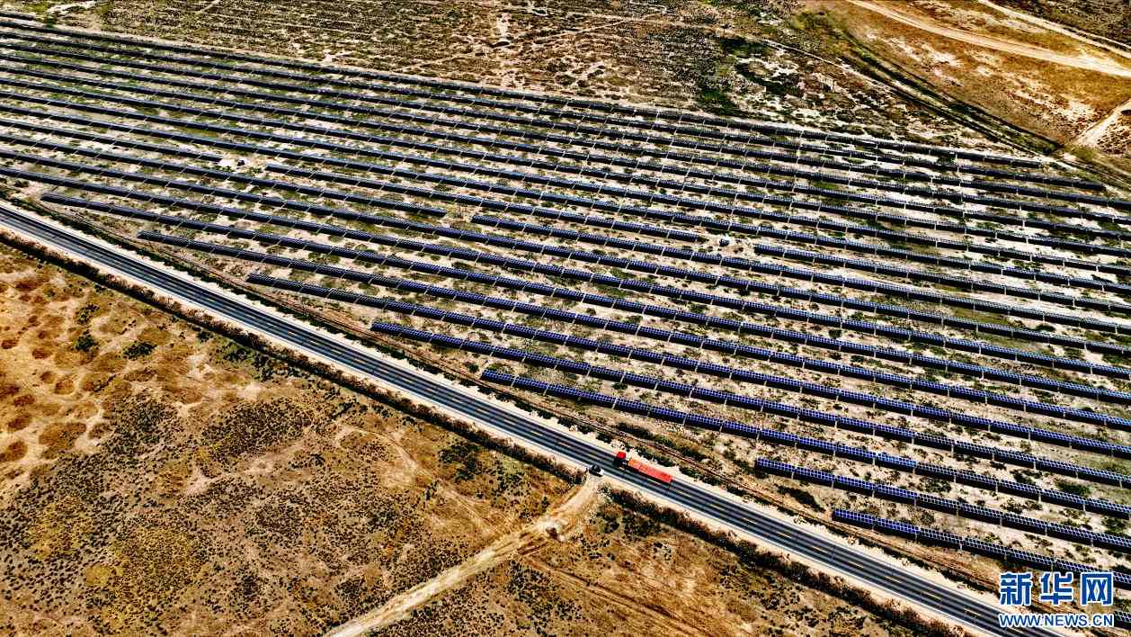 ??6月14日,在地處科爾沁沙地邊緣的翁牛特旗其甘地區(qū)拍攝的光伏發(fā)電場(chǎng)。新華網(wǎng)發(fā)(李富 攝)
