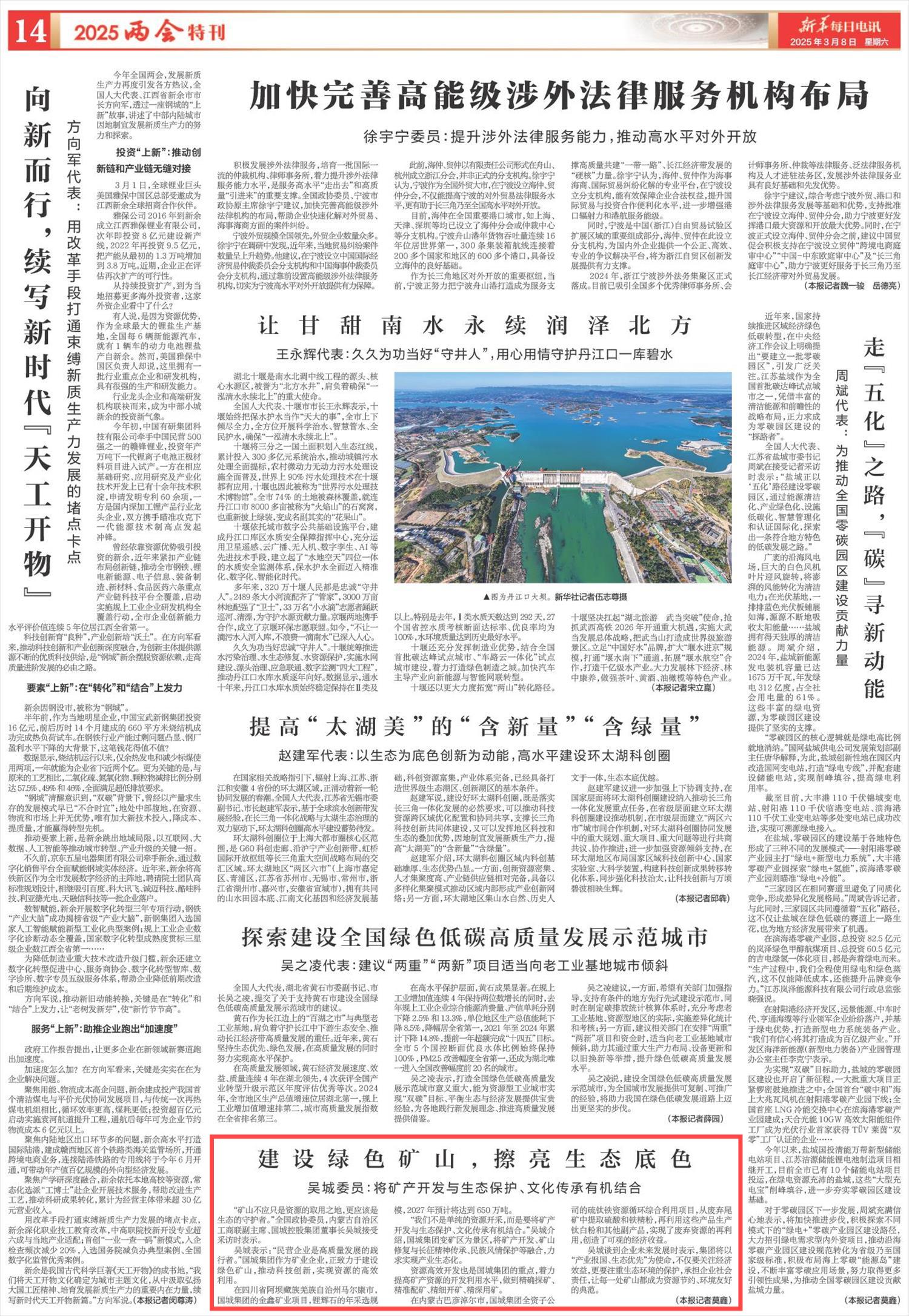 2025年3月8日,《新華每日電訊》第14版刊發(fā)題為《建設綠色礦山,擦亮生態(tài)底色》的消息,報道了吳城委員介紹,“我們不是單純的資源開采,而是要將礦產開發(fā)與生態(tài)保護、文化傳承有機結合?!?/p>