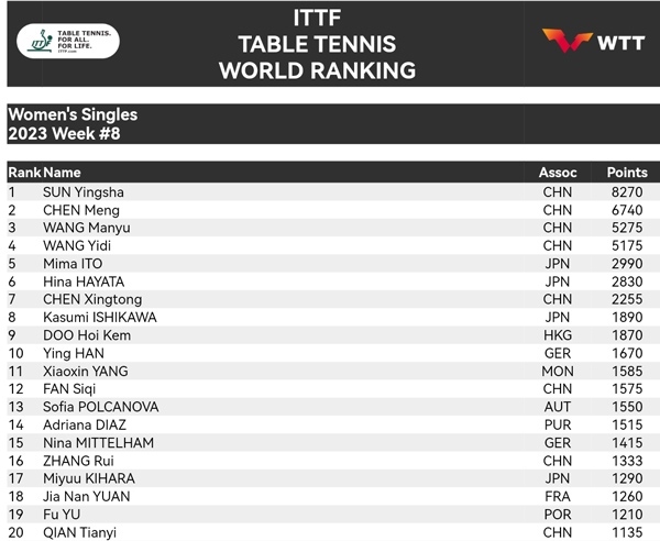女單排名 圖片來源:國際乒聯(lián)官網(wǎng)