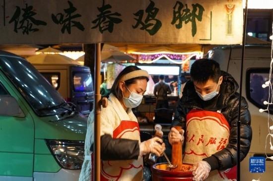 在四川省成都市錦江區(qū)三色路夜市,市民在購買小吃(2月28日攝)。