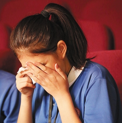 閉上眼睛,頭微微向上抬起,馬德麗認認真真傾聽解說詞,舍不得漏掉一字一句。遇到驚險刺激的情節(jié),她緊張地抓住座椅扶手。身旁的同伴唐發(fā)米、王惠容,同樣“看”得入神。
