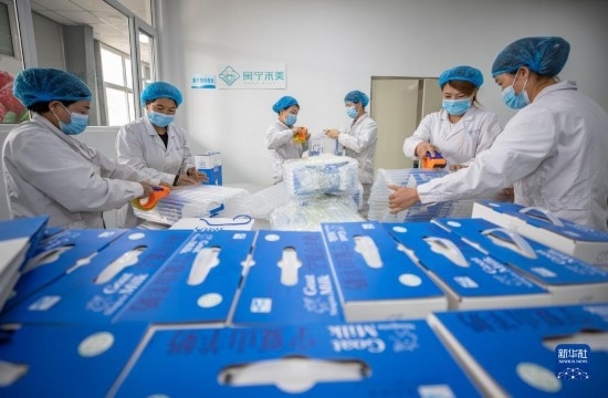 5月1日,在寧夏銀川市永寧縣閩寧鎮(zhèn)禾美電商車間,工作人員在打包產(chǎn)品。