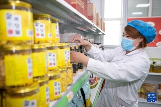 5月1日,在寧夏銀川市永寧縣閩寧鎮(zhèn)禾美電商車間,工作人員在整理商品。