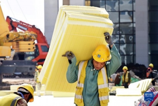 5月1日,中建八局四公司的工人在山東省青島市高新區(qū)康復(fù)大學(xué)項目工地施工。