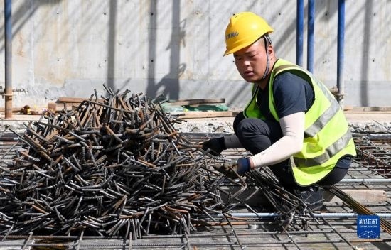 5月1日,在浙江省杭州市臨平區(qū)一個項目工地,中建三局的建設(shè)者在施工中。