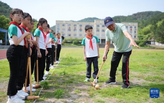 5月25日,小學(xué)生在教練帶領(lǐng)下學(xué)習(xí)木球。
