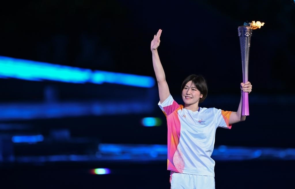 第一棒火炬手葉詩文高擎亞運(yùn)火炬入場(chǎng),樊振東、徐夢(mèng)桃、石智勇、李玲蔚、汪順5名火炬手接力奔跑,他們都曾在國際體育舞臺(tái)取得驕人成績。場(chǎng)外,光影匯聚而成的“數(shù)字火炬手”出現(xiàn)在杭城夜空。