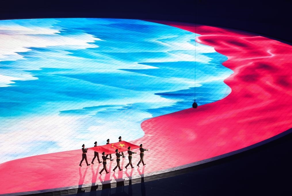 地屏上,一幅紅綢飛掠壯麗河山。8名儀仗兵步伐鏗鏘,護(hù)旗入場(chǎng)?!拔覑勰阒袊覑勰愦禾炫畈难砻纭眲?dòng)人的贊歌深情唱響。