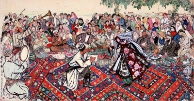繞過紅色展墻,黃胄于1962年創(chuàng)作的《豐樂圖》赫然在目,拉開了展覽第一篇章的序幕。花團(tuán)錦簇的地毯上擺滿瓜果,人們圍坐在一起載歌載舞,歡慶豐收。畫面中的眾多人物雖姿態(tài)各異,但都喜笑顏開,感染著觀者。作品描繪出熱烈的慶祝場面,富有濃郁的地域特色,是新疆各族人民團(tuán)結(jié)和睦、意氣風(fēng)發(fā)的生動寫照。