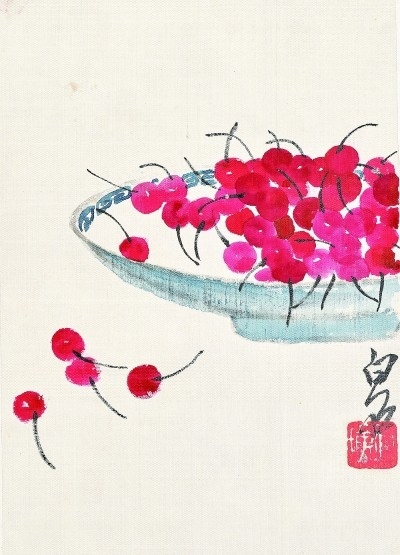 展柜中,不大的冊頁引得眾人圍觀。顆顆櫻桃被齊白石描繪得鮮嫩欲滴,它們擠在一個素樸的青花瓷盤中,還有幾顆散落在外,尤其鮮亮奪目?!侗P中櫻桃》是齊白石《聚珍十開冊》中的一幅,作于20世紀(jì)30年代。在這套冊頁中,無論是荷花游魚、麥穗螞蚱還是汀渚魚鷹,都在齊白石筆下顯得格外逼真?zhèn)魃瘛?/p>