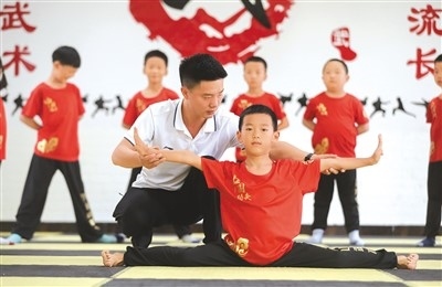 暑假期間,貴州省貴陽(yáng)市開陽(yáng)縣青少年學(xué)生校外活動(dòng)中心免費(fèi)開辦少兒武術(shù)班,吸引當(dāng)?shù)貝酆梦湫g(shù)的孩子參加學(xué)習(xí)。圖為7月18日,在少兒武術(shù)班,孩子們?cè)诶蠋煹闹笇?dǎo)下練習(xí)武術(shù)動(dòng)作。袁福洪攝(人民圖片)