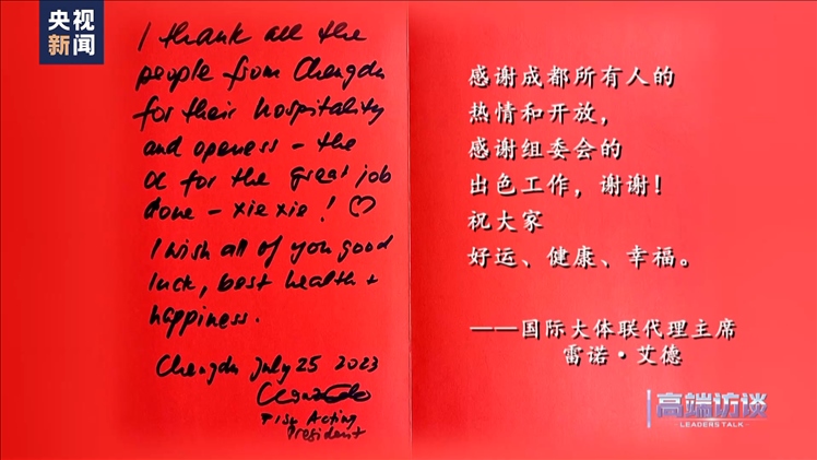 國際大體聯(lián)代理主席雷諾·艾德在接受總臺專訪后題詞:感謝成都所有人的熱情和開放,感謝組委會的出色工作,謝謝!祝大家好運(yùn)、健康、幸福。