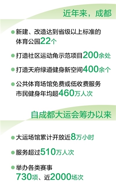 成都市體育局副局長(zhǎng)陳志表示:“近年來(lái),成都新建、改造達(dá)到省級(jí)以上標(biāo)準(zhǔn)的體育公園22個(gè),打造社區(qū)運(yùn)動(dòng)角示范項(xiàng)目200余處、天府綠道健身新空間400余個(gè),公共體育場(chǎng)館免費(fèi)或低收費(fèi)服務(wù)市民健身年均超460萬(wàn)人次?!?/p>