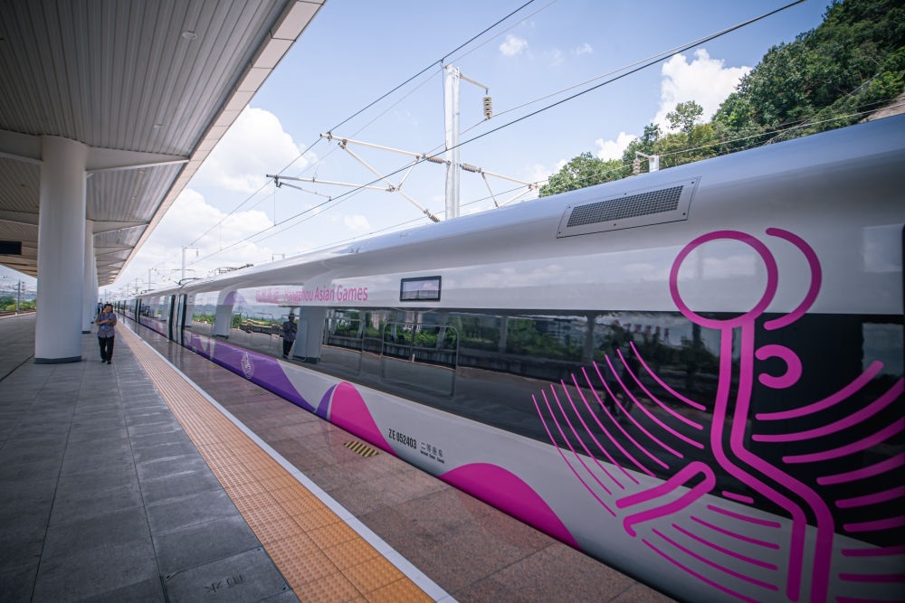 這是亞運智能動車組停靠在德清站站臺(2023年8月4日攝)。新華社記者 江漢 攝